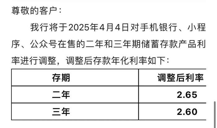 除了上述全国性股份制银行,4月起,部分中小银行也下调了存款产品利率。安徽新安银行发布公告称,该行于4月4日对存款产品执行新的利率政策。调整后,两年、三年存款利率分别为2.65%、2.60%,分别下调15个基点、20个基点。一年期、六个月、三个月定期存款利率维持不变。该行同样出现两年期、三年期存款利率倒挂的情况。